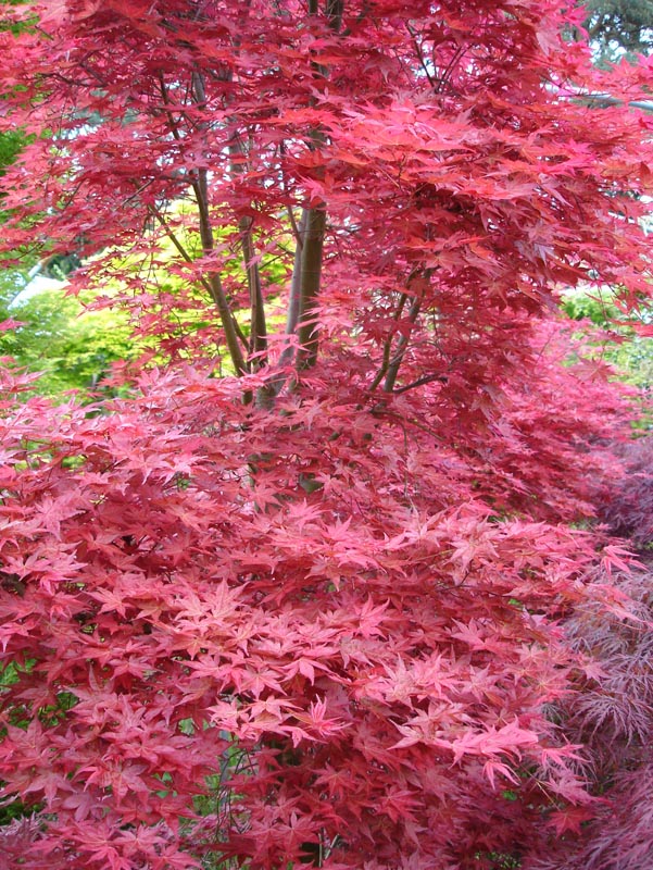A really brilliant Japanese Maple with flaming red spring foliage ageing to green flushed pink, flecked cream and orange-red in autumn. Requires a fertile, slightly acid, moist, well drained soil and shelter from the morning sun. Height 6 feet in 10 years.
