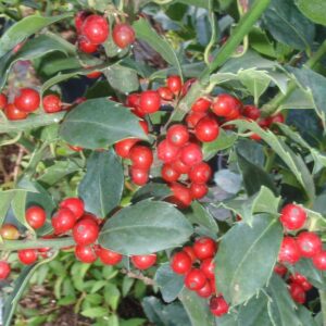 NEW. A superb evergreen Holly which has an extremely dense habit, purplish shoots bearing softly spiny, glossy, dark blue-green leaves. A female form which bears small white flowers, and bright red berries when pollinated. Will grow in most fertile, well drained soils in sun. Clip to shape