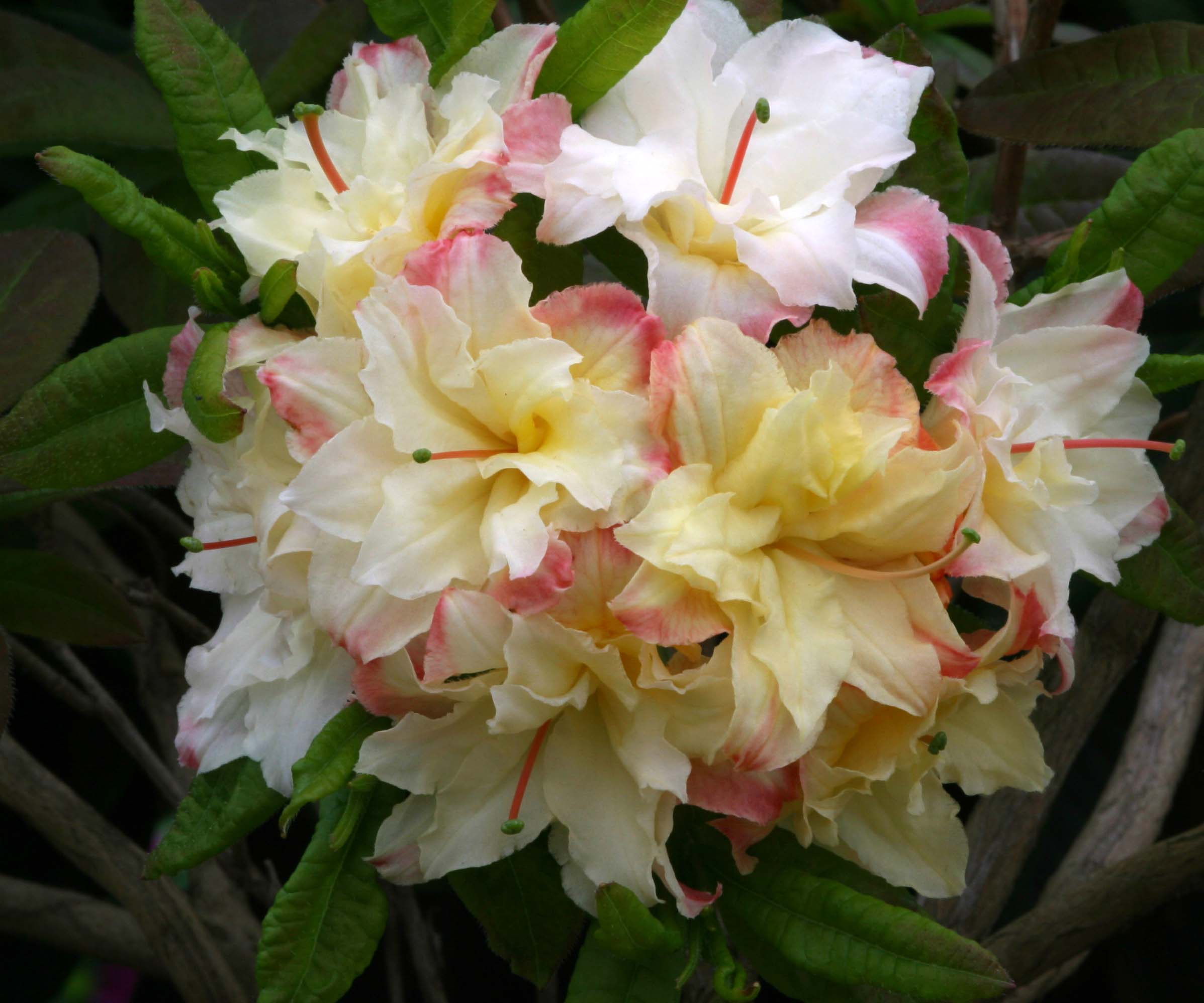 A superb deciduous azalea with brilliant autumn foliage. Semi-double white tinted pink flowers have a yellow flare. Requires a fertile, acid soil. Work in plenty of composted bark or peat. Sun or part shade. Height 4 to 6 feet.