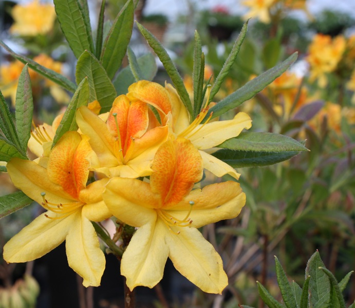 A deciduous azalea, with mid-green leaves and funnel-shaped golden yellow flowers in mid-spring. Requires a fertile, well drained acidic soil in part shade. Incorporate plenty of peat or composted bark. Height 4 feet.