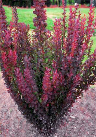 A neat very upright shrub with coppery red leaves and small yellow flowers borne in May. Brilliant autumn foliage. Good as hedging. Best in a fertile soil in full sun. Height 4 feet.