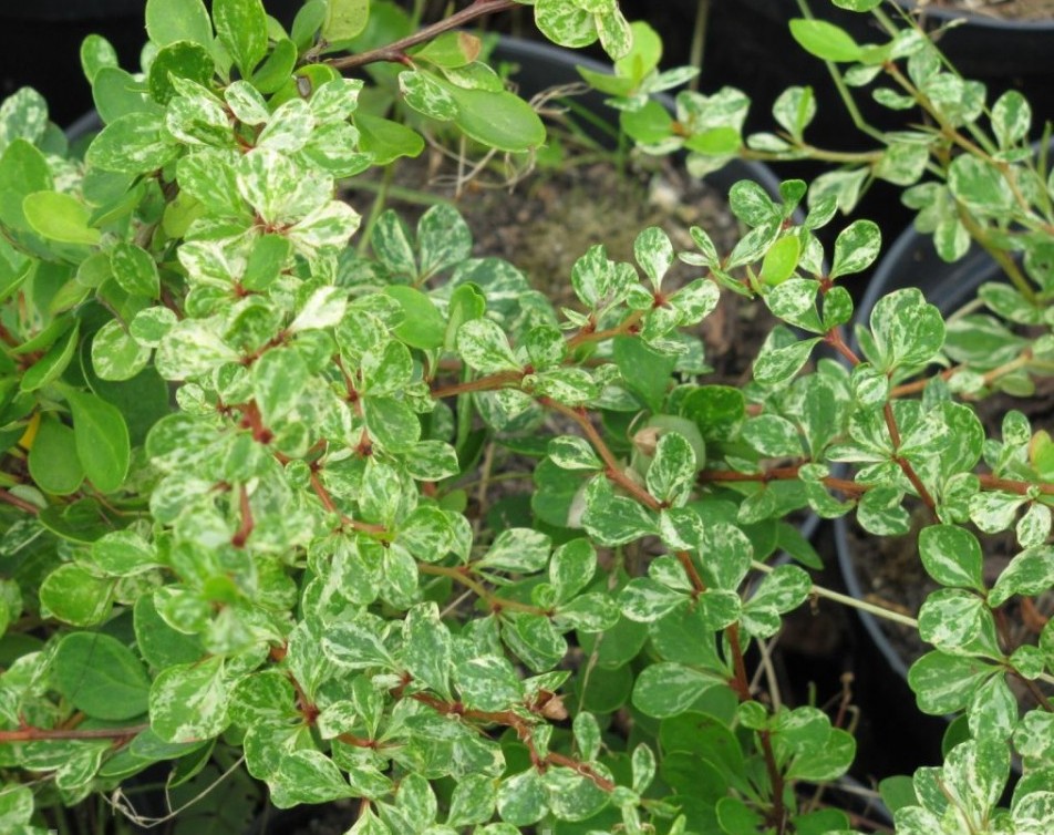 A compact, deciduous shrub with variegated leaves; the creamy-white portion of the leaf turns pink in autumn. Small yellow flowers in June. Red berries late summer. Will grow in most fertile well drained soils in sun. Height 4 to 6 feet.