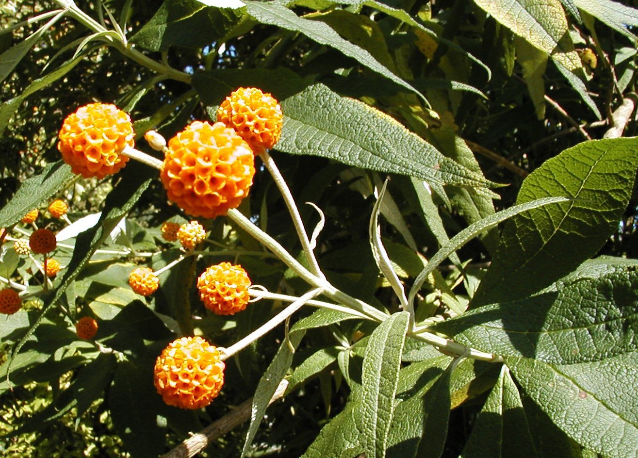 A strong growing shrub with large green leaves. Orange-yellow ball shaped flowers are produced on previous years branches in June. Prune after flowering. Will grow in most fertile well drained soils in sun or part shade. Height 8 feet.
