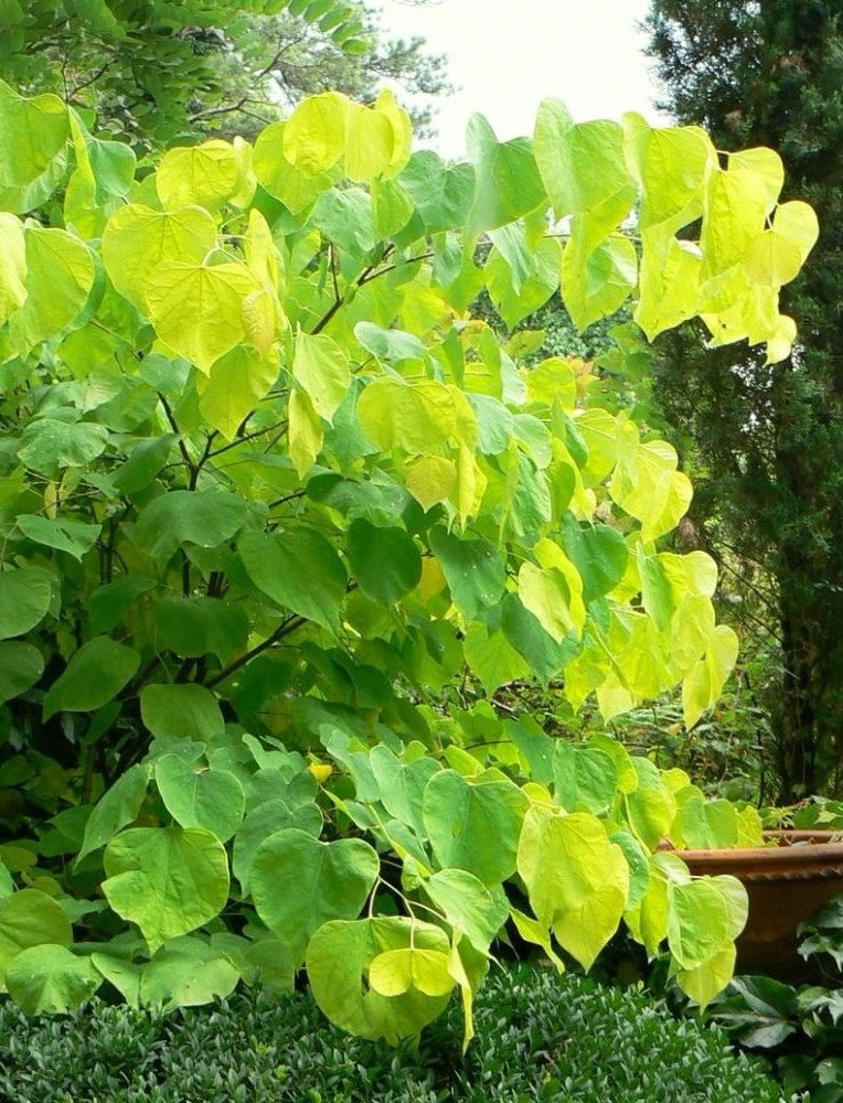 New. A superb, deciduous shrub whose lavender-red flowers are borne in May before its striking heart-shaped golden foliage appears, young foliage is often flushed orange and red. Requires a fertile, well drained soil in sun. Height 10 feet.