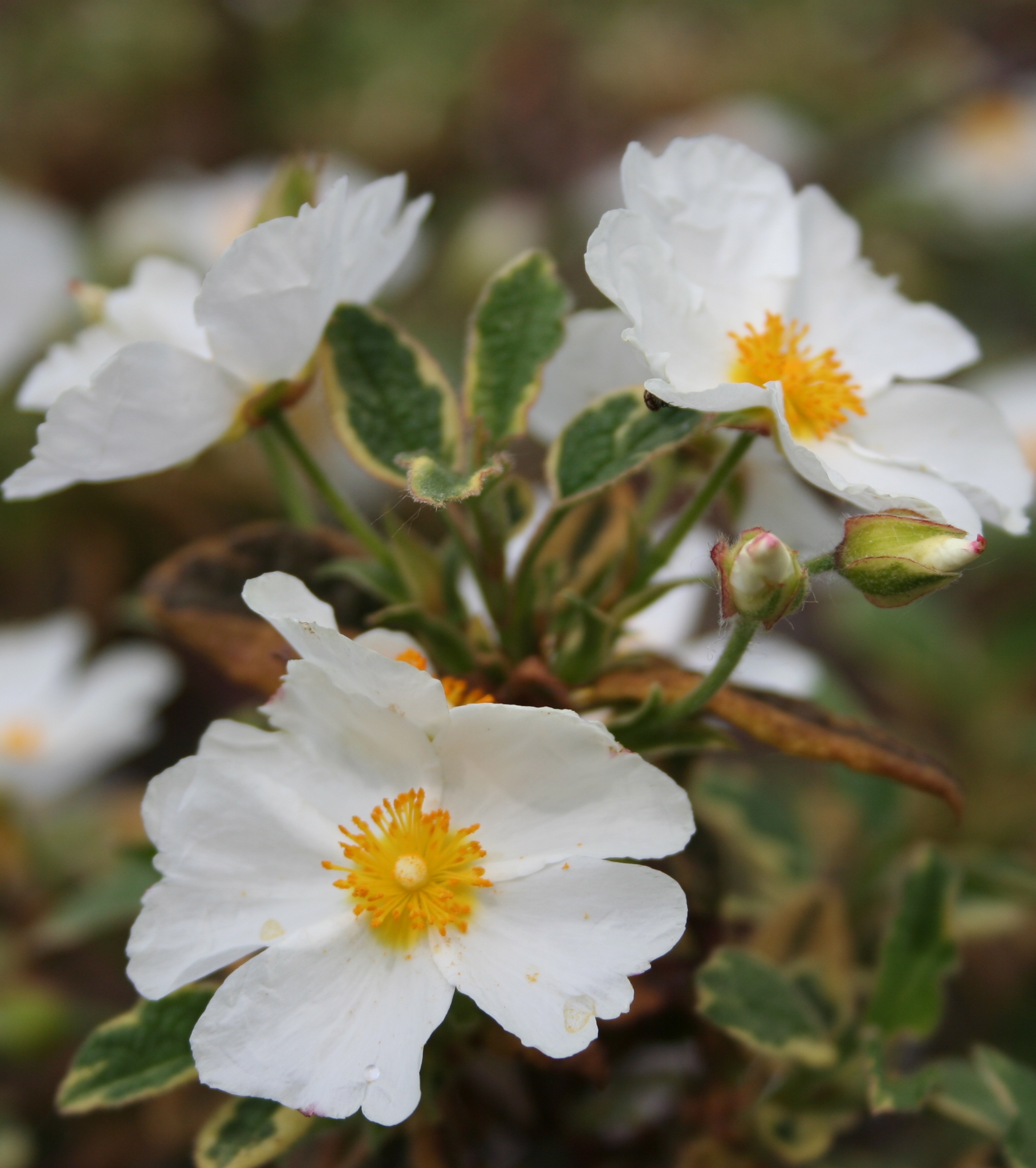 Evergreen, bushy, dense shrub. Has wrinkled, wavy edged, dark green leaves and massed white flowers, with central, yellow blotches, carried in late spring and early summer. Requires full sun and well drained soil. Height and spread 3 feet by 3 feet.