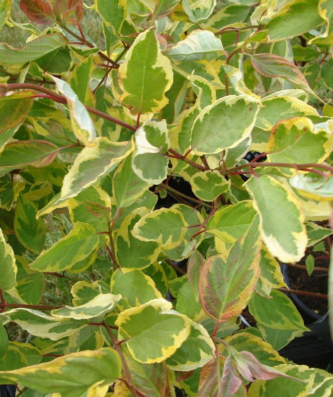 A medium sized deciduous shrub whose stems turn a blood red in the winter. Soft yellow variegated leaves and heads of white flowers in May. Requires a fertile, moist soil in sun or part shade. Can be pruned hard back in late March. Height 4 to 6 feet.