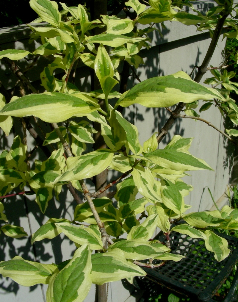 RARE. An outstanding shrub with creamy-white variegated leaves and masses of small yellow flowers during March. Will grow in most fertile, well drained soils in sun or part shade. Height 10 feet.