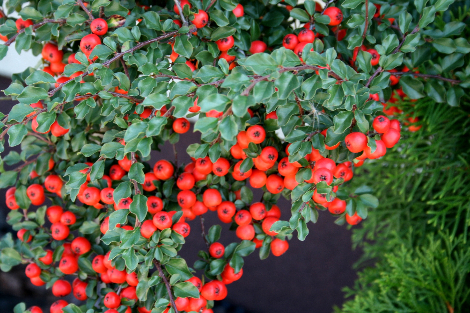 Evergreen, arching dense shrub which has small oval, glossy dark green leaves and in early summer has small white flowers. Bright orange-red berries in late summer. Requires full sun and well drained soil. Height 3 feet. Mini-standard height 4 feet.