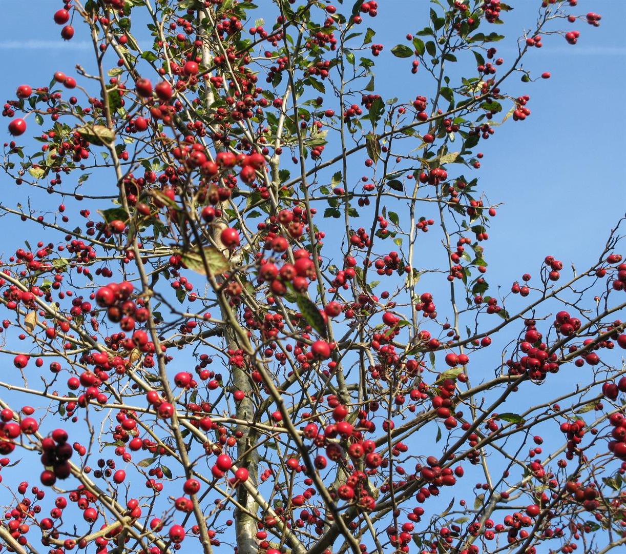 A remarkable American thorn whose rounded green leaves are often retained until early winter. Masses of white flowers in June are followed by bright red haws. Will grow in most fertile moist but well drained soils in sun or part shade. Height 30 feet.