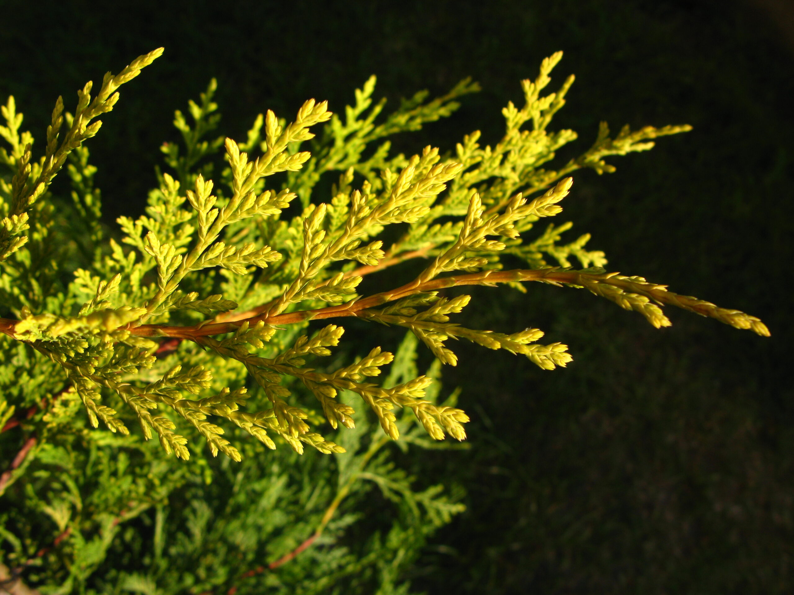 A very strong growing upright conifer with gold foliage. Can be grown as a hedge if clipped in April and September. Requires a fertile, well drained soil in sun. Height 80 feet, unclipped.