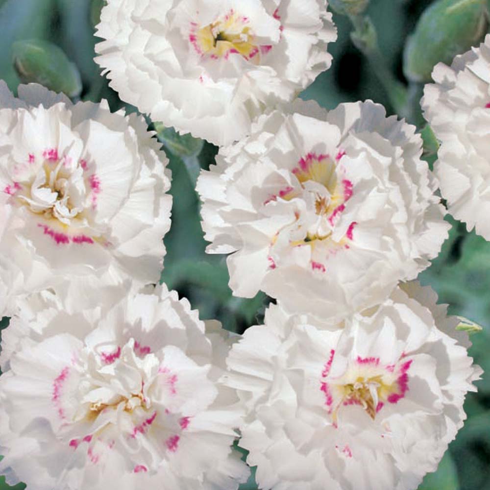 A lovely Pink, which has lovely, lance-shaped silver grey leaves, forming a tight mound, from which fragrant double, white flowers, with pale pink centres emerge in late Spring to Autumn. Requires a fertile, well-drained soil in full sun. Ideal for a gravel garden. Height 1ft.