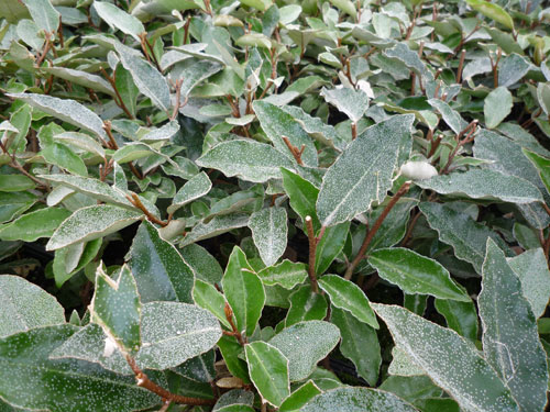 An upright, bushy, evergreen shrub with oblong, leathery, dark green leaves. Bears small, fragrant, creamy-white flowers in autumn. Requires full sun and well drained soil. Height 10 feet.