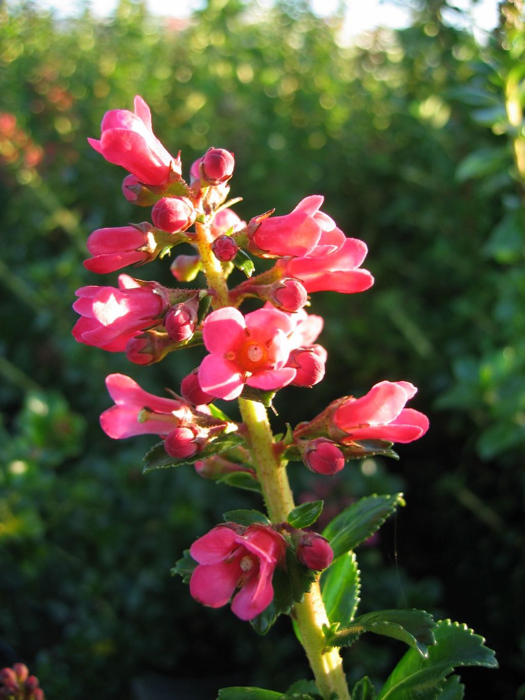 A large evergreen shrub with dark green leaves and masses of small rose-red flowers in May and June. Best in full sun in a well drained soil. Height 6 to 7 feet.