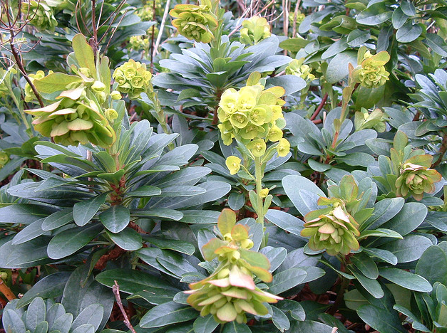 Harmful if eaten/skin + eye irritant. Evergreen, spreading perennial with rosettes of dark green leaves, good ground cover in poor, dry soil and semi-shade. Lime-green flowers in spring. Height 2 feet. Requires partial shade and moist soil.