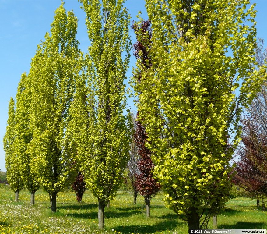 A superb very upright deciduous tree whose leaves are yellow in the Spring and early Summer. Will grow in most fertile, well drained soils in sun. Height 30 feet.
