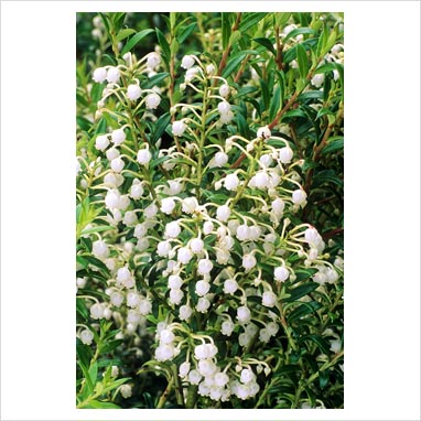 Evergreen shrub with masses of small white flowers in May. The MALE FORM which is necessary to pollinate female Mucronata cultivars. Requires a fertile, acid soil in sun or part shade. Height 2 feet.
