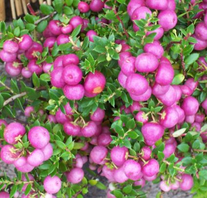 Evergreen shrub with small dark green foliage, bearing white flowers in May and pink berries in winter. Needs a male pollinator. Requires a fertile, peaty soil in sun or part shade. Height 2 feet.