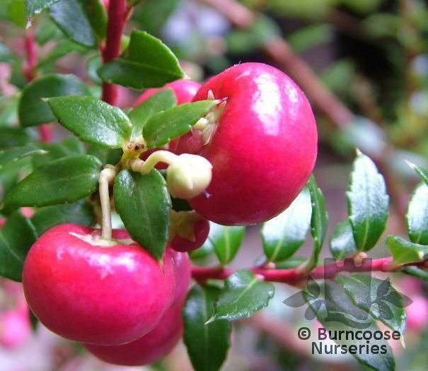 Low growing evergreen shrub with small spine tipped leaves. White flowers in May and large translucent lilac-pink berries throughout the autumn and winter. ‘Lilian’ is female and needs a male to pollinate it. Best in an acid soil in sun. Height 2 feet.