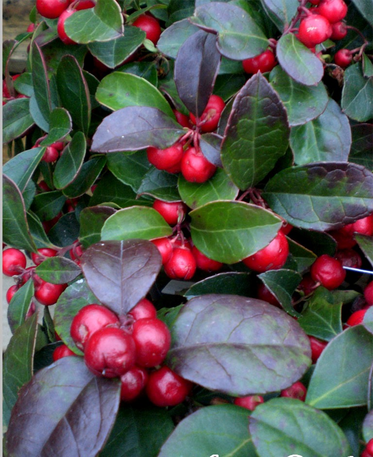 A dwarf creeping evergreen shrub which forms a carpet of dark green leaves. Small white flowers are followed in late summer by bright red berries. Requires a fertile peaty soil and fruits better in sun. Berries harmful if eaten. Height 6 inches.