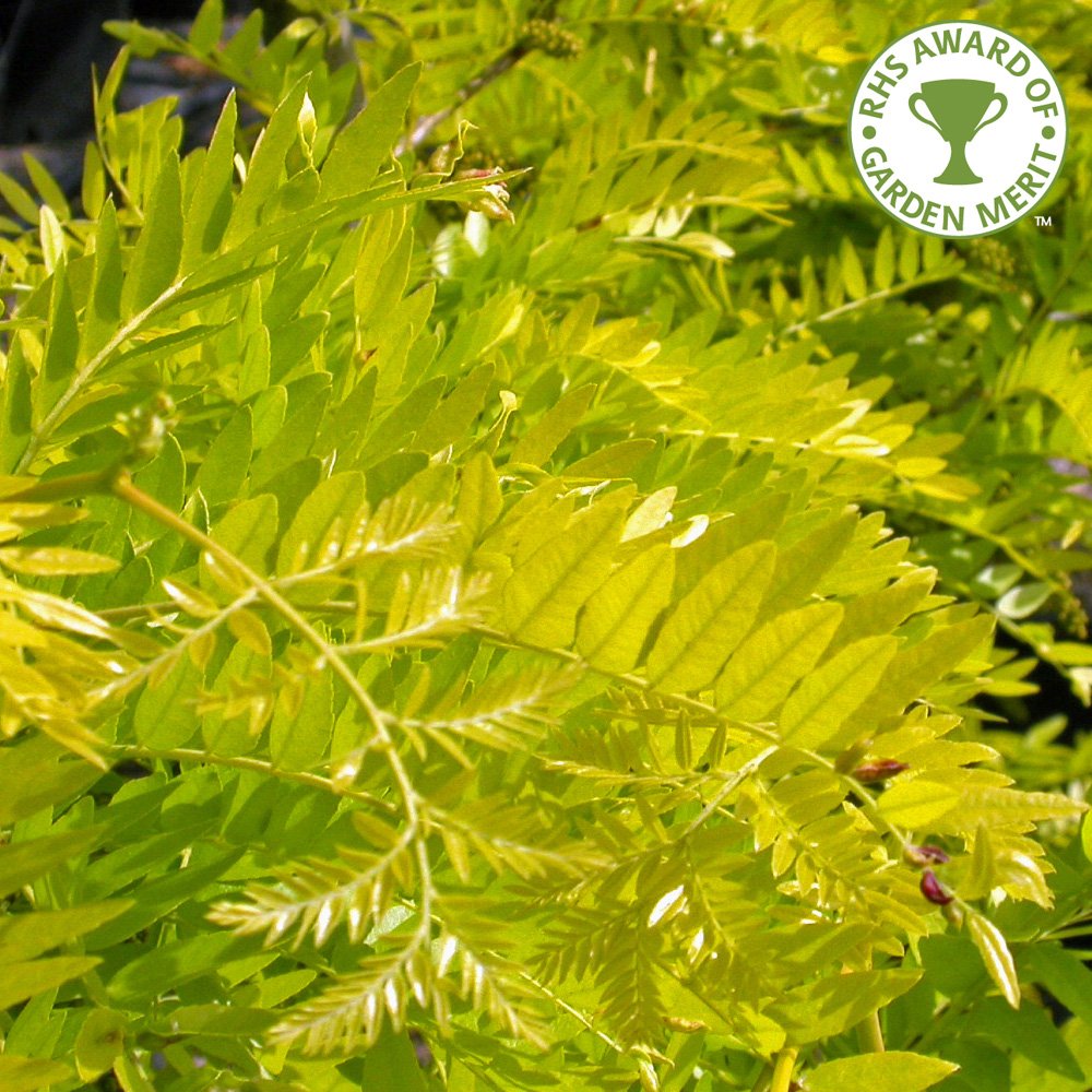 Deciduous, spreading tree with fern like glossy foliage that is golden yellow when young, deep green in Summer. Requires full sun and well drained soil. Height 30 feet in 20 years.