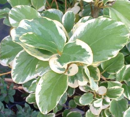 A lovely upright evergreen shrub with large green variegated cream leaves. Will grow in most fertile well drained soils and will tolerate maritime exposure. Height 10 feet.