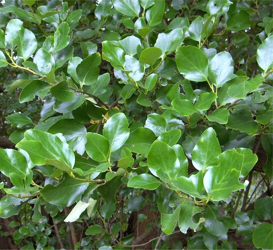 Large evergreen shrub with glossy apple-green leaves. Excellent seaside shrub, but resents cold, windy sites inland. Will grow in most fertile, well drained soils in sun or part shade. Height 10 feet.