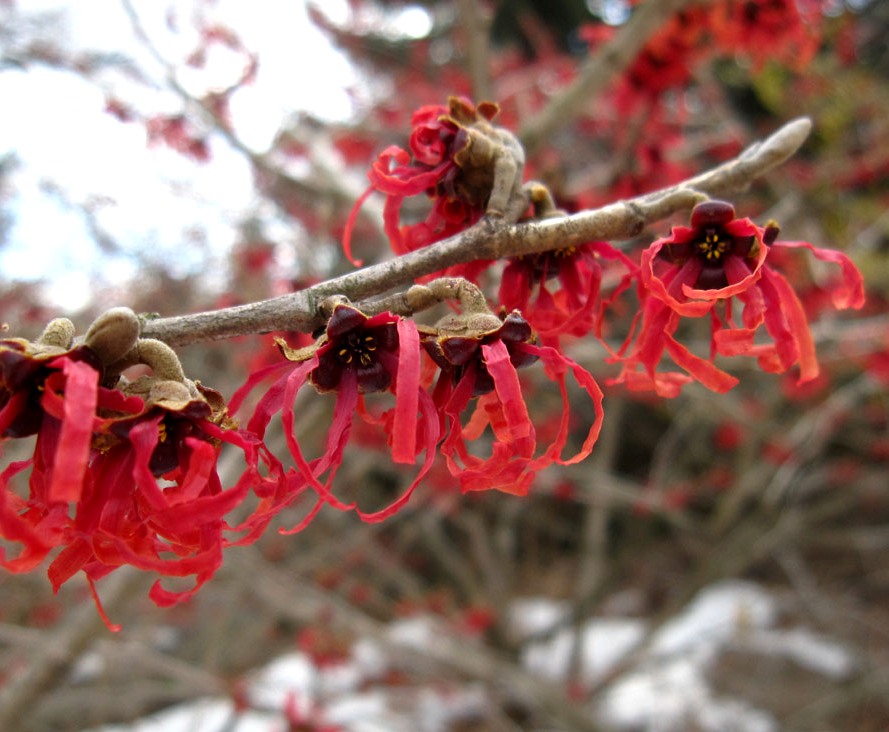 A lovely ‘Witch Hazel’ which is upright when young but bushes into a rounded shrub. Masses of carmine-red flowers on naked branches from late January to March. Requires a fertile, slightly acid, moist, but well drained soil sheltered from the north east. Height 8 feet.