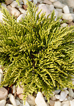 A dwarf spreading evergreen with unusual ‘ochre-gold’ coloured, whip cord-like foliage. Few white flowers in May and June. Excellent rockery plant. Requires a fertile, well drained soil in Sun. Height 1 feet.