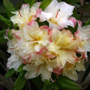 A lovely evergreen shrub with dark green, glossy foliage. Large heads of pastel pink flowers, with a yellow flare on the upper petal are borne in May. Requires a moist, peaty soil in sun or part shade. Height 6 to 8 feet.