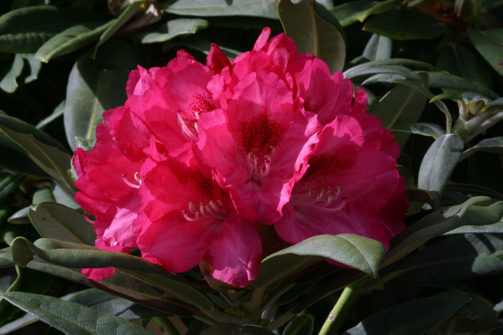 A neat compact yakushimanum hybrid whose dark green leaves have a brown felted underside. Rose pink flowers with a red flare are borne during May and June. Best in a peaty, woodland type soil in full sun or part shade. Height 5 feet.