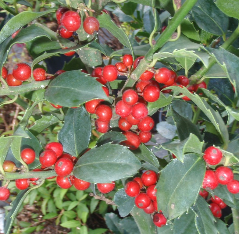 NEW. A superb evergreen Holly which has an extremely dense habit, purplish shoots bearing softly spiny, glossy, dark blue-green leaves. A female form which bears small white flowers, and bright red berries when pollinated. Will grow in most fertile, well drained soils in sun. Clip to shape